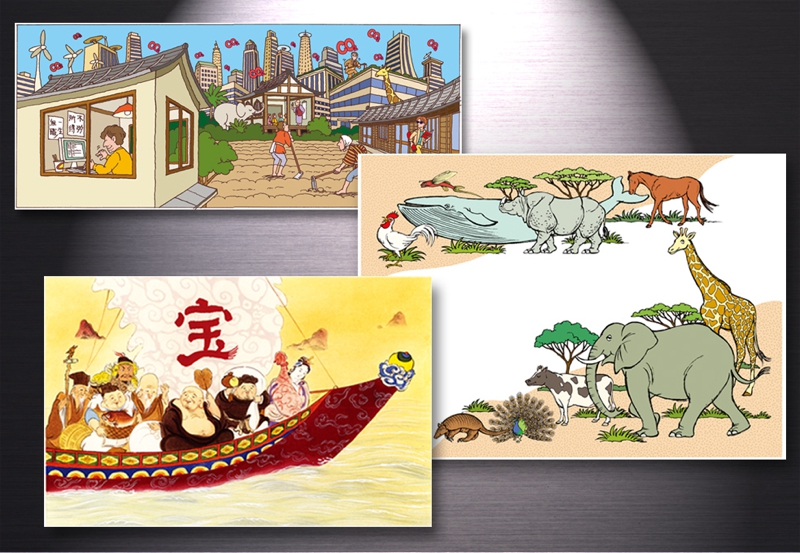 キャラクターと半リアルな背景で構成するイラストが中心です。